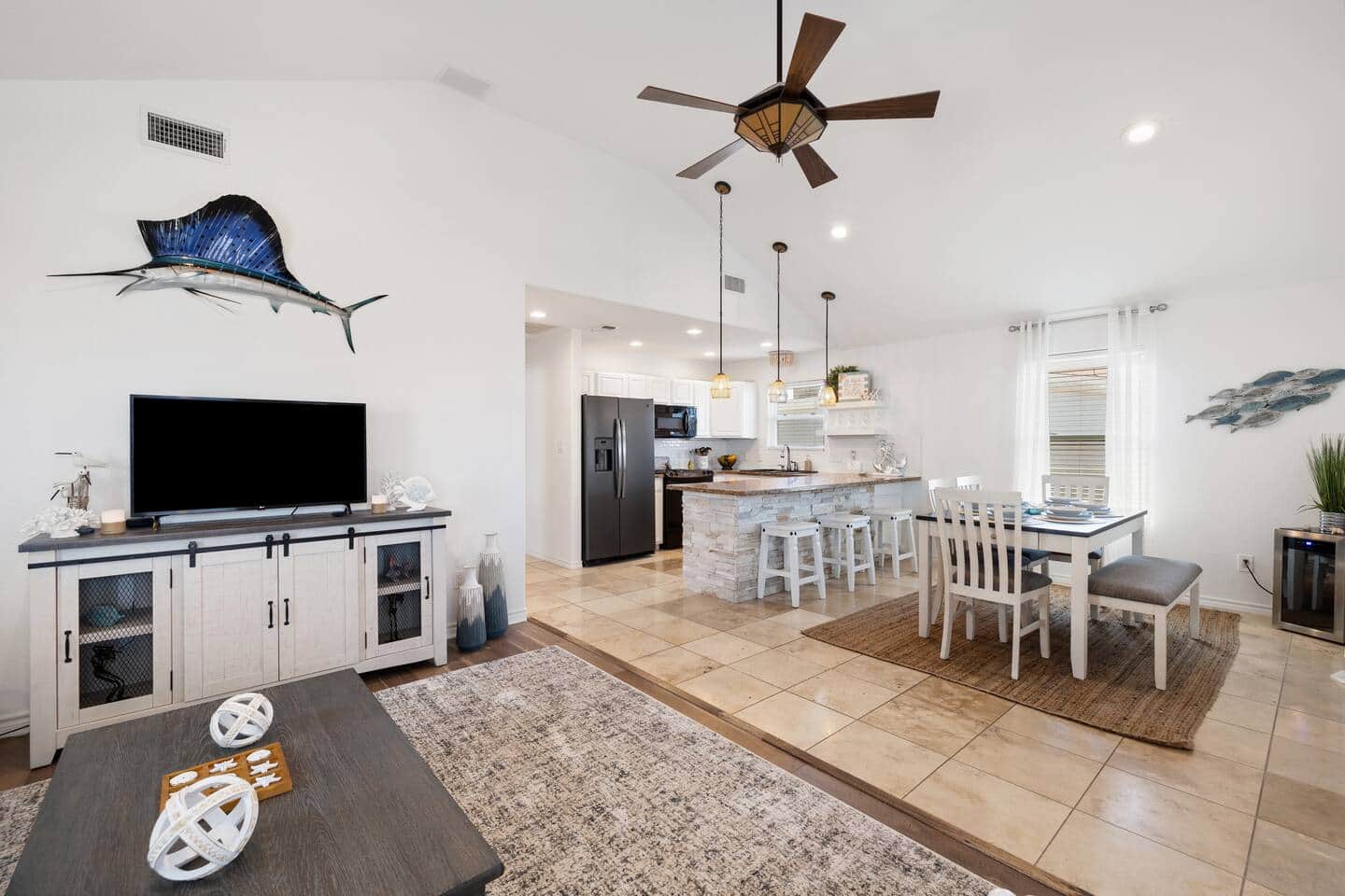 Come and enjoy a relaxing stay at this clean and well-maintained home nestled close to the sandy beaches of Galveston, Texas. Perfectly designed for a family vacation, this home features 3 bedrooms and 2 and a half bathrooms. The primary bedroom and bedroom #2 both feature a queen-size bed while bedroom #3 has two sets of twin-size bunk beds. An open floor plan joins the family room, dining room, and kitchen together. The openness of this house is further accentuated by a vaulted ceiling providing ample space for you and your group to spend time together. Even more impressive is the outdoor space provided by this home. Outdoor seating, a gas grill, and a TV have all been provided for guest enjoyment on the ground level and the garage has been remodeled into a secondary kitchen and half bathroom. The secondary kitchen features a microwave, blender, tons of cabinet space, running water, and a fridge/freezer combination. No need to run upstairs for another cold drink. You can even choose to bring everything to the lower patio for a nice BBQ dinner together. The first level bathroom has its obvious benefits as well. These unique additions help to make spending time with friends and family at this home more convenient and fun.